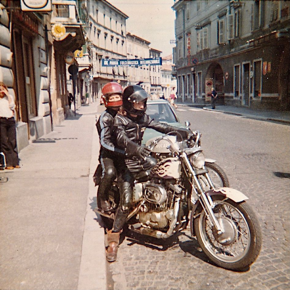 Den Führerschein machte ich in Deutschland, in Ludwigshafen und ab da durfte ich Motorrad fahren. Es wurde zunächst eine Suzuki GT 380. Nach wenigen Monaten habe ich sie zu Schrott gefahren. Ich hab es überlebt und kehrte bald, nachdem ich wieder auf den Beinen, war nach Österreich zurück. Dort bot sich mir eine 1972er Harley-Davidson Sportster zum Kauf an. Noch vor der Probefahrt war sie geistig mein. In einer Zeit wo englische Motorräder nach und nach von japanischen im Straßenbild verdrängt wurden, war ich stolz darauf, mit einem aus den USA zu fahren. In den vielen Jahren, in denen ich mein Bike immer wieder umbaute und neu gestaltete, konnte ich leider ein Problem nie zufriedenstellend lösen: das »Starterritzel« gab oft den Geist auf und musste erneuert werden. Das war besonders unangenehm in Florenz wo so etwas natürlich nicht zu bekommen war.