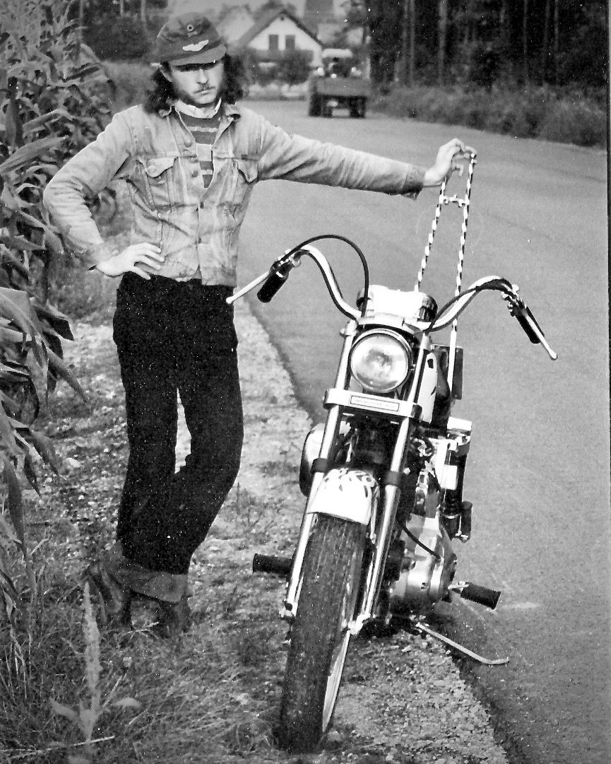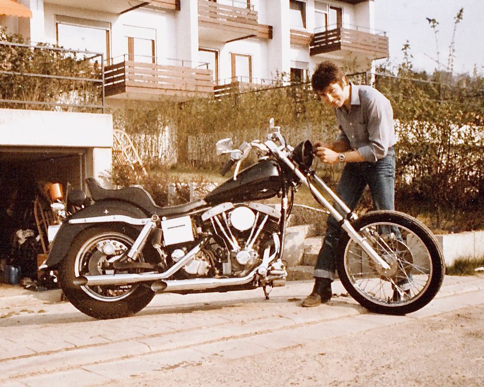 Kanada-Aufenthalt traf ich eine Menge kreativer Biker die ihre Motorräder oft extrem umgestalteten. »Long-sleek-and-low« war die Devise. Zurück in Ludwigshafen ging ich daran auch meine Harley auf diese Art umzubauen. Mit Freunden aus Heidelberg gingen wir daran zunächst die Brust-Rahmenrohre zu zerschneiden um den Lenkkopf-Winkel zu verändern. Mit verlängerter Gabel wurde das Bike so um einen halben Meter länger. Dann noch einen Tank einer alten Indian angepasst und noch einiges Zierrat angebaut.