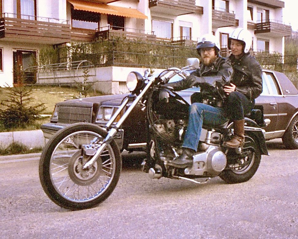 Den Führerschein machte ich in Deutschland, in Ludwigshafen und ab da durfte ich Motorrad fahren. Es wurde zunächst eine Suzuki GT 380. Nach wenigen Monaten habe ich sie zu Schrott gefahren. Ich hab es überlebt und kehrte bald, nachdem ich wieder auf den Beinen, war nach Österreich zurück. Dort bot sich mir eine 1972er Harley-Davidson Sportster zum Kauf an. Noch vor der Probefahrt war sie geistig mein. In einer Zeit wo englische Motorräder nach und nach von japanischen im Straßenbild verdrängt wurden, war ich stolz darauf, mit einem aus den USA zu fahren. In den vielen Jahren, in denen ich mein Bike immer wieder umbaute und neu gestaltete, konnte ich leider ein Problem nie zufriedenstellend lösen: das »Starterritzel« gab oft den Geist auf und musste erneuert werden. Das war besonders unangenehm in Florenz wo so etwas natürlich nicht zu bekommen war.