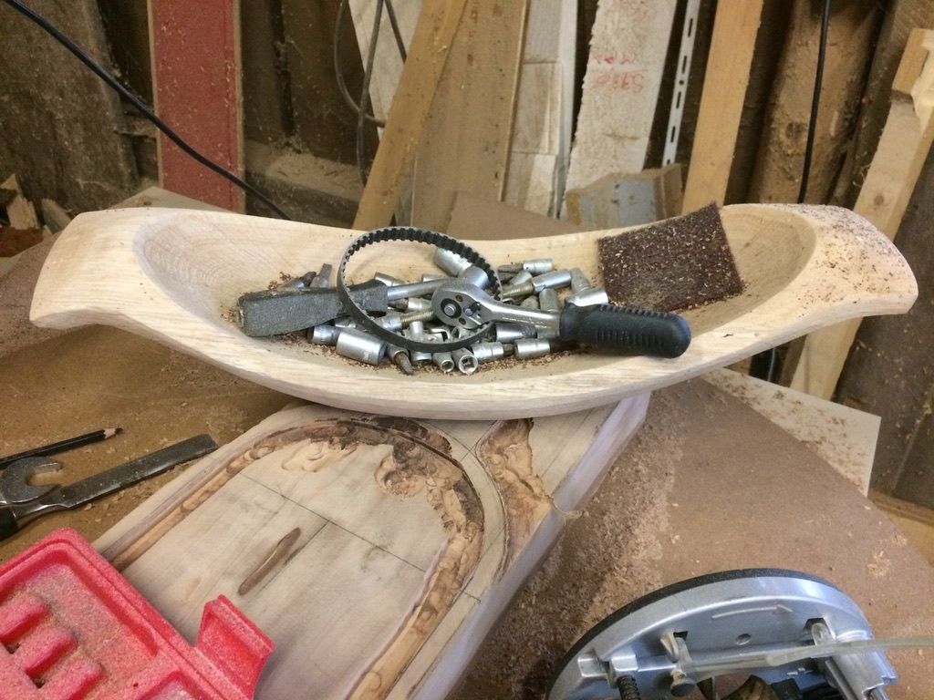 Zu meinen wichtigsten Werkzeugen zählen eine Auswahl von Schnitzmessern für präzise und detaillierte Schnitzarbeiten. Kräftige Fräsen ermöglichen eine präzise aber auch zügige Formgebung und können für viele Projekte verwendet werden.